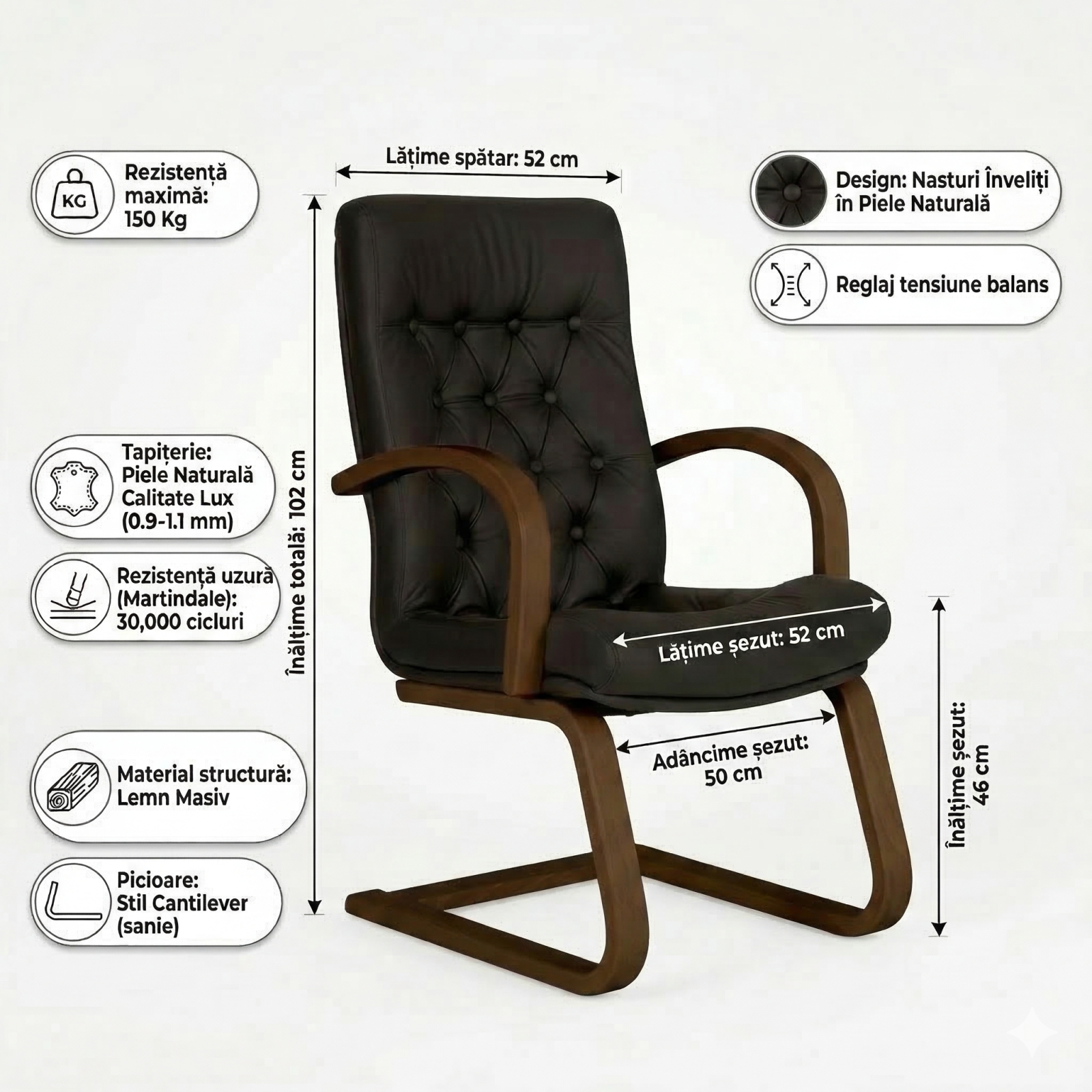 Piele naturala de calitate Lux: Intreaga suprafata de contact este tapitata cu piele naturala premium (0.9-1.1 mm), oferind un aspect sofisticat si o rezistenta sporita la uzura (30.000 cicluri Martindale).