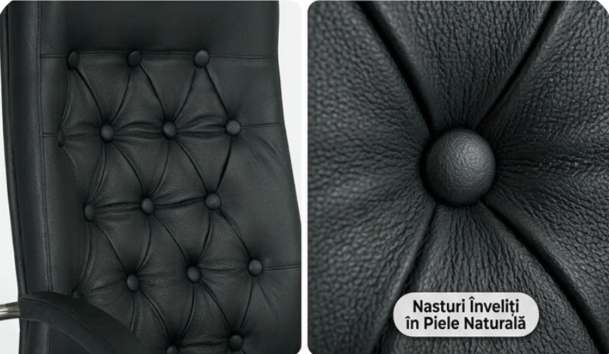 Design elegant cu nasturi: Spatarul si sezutul sunt decorate cu nasturi inveliti in piele naturala, un detaliu artizanal care confera originalitate si un stil aristocratic.