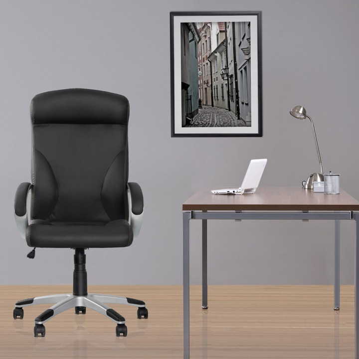 Baza stea cu diametrul de 72 cm este din plastic, cu placi reliefate de culoare neagra. Bratele sunt din polipropilena, placate cu paduri moi, capitonate cu piele ecologica.